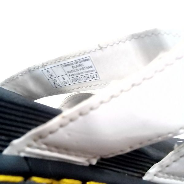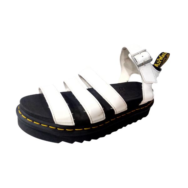 Dr. Martens Blaire in white leather pairs sculpted, wide straps with a chunky, treaded sole for modern utility and refined summer style. Adjustable buckle fastening ensures a secure, custom fit while the signature AirWair air‑cushioned sole delivers day‑long comfort and reliable grip. Reinforced stitching and a clean, architectural profile give durable structure and polished attitude — a versatile Doc Martens sandal that elevates warm‑weather looks.