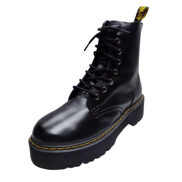 Unleash a bold statement with the Dr. Martens Jadon Platform Black Leather Boots. This fierce evolution of the classic 8-eye boot boasts a commanding, head-turning platform silhouette. Crafted from durable Polished Smooth leather, these Dr. Martens boots retain all original details including grooved edges, iconic yellow stitching, and a signature heel-loop. An inner ankle zip ensures easy wear, making these Dr. Martens Jadon boots a perfect blend of style, comfort, and the legendary durability you expect.