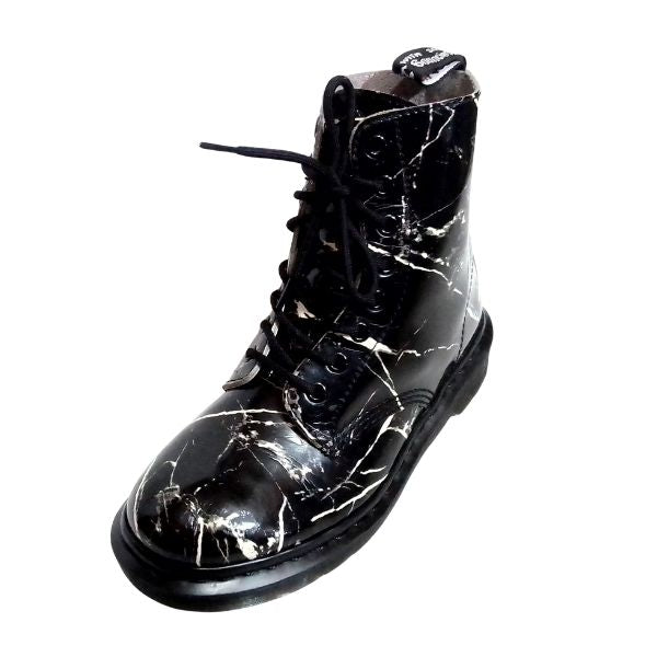 The Dr. Martens Pascal Marble Black & White Patent Leather Boots feature a glossy marble-effect finish that commands attention. With Goodyear-welted construction, tonal hardware, and the signature AirWair air-cushioned sole, they deliver lasting durability and all-day comfort. Ideal for collectors of Second Hand Dr. Martens seeking iconic style, these 8-eye lace-ups balance bold design with timeless craftsmanship.